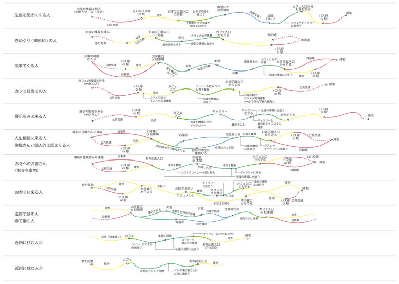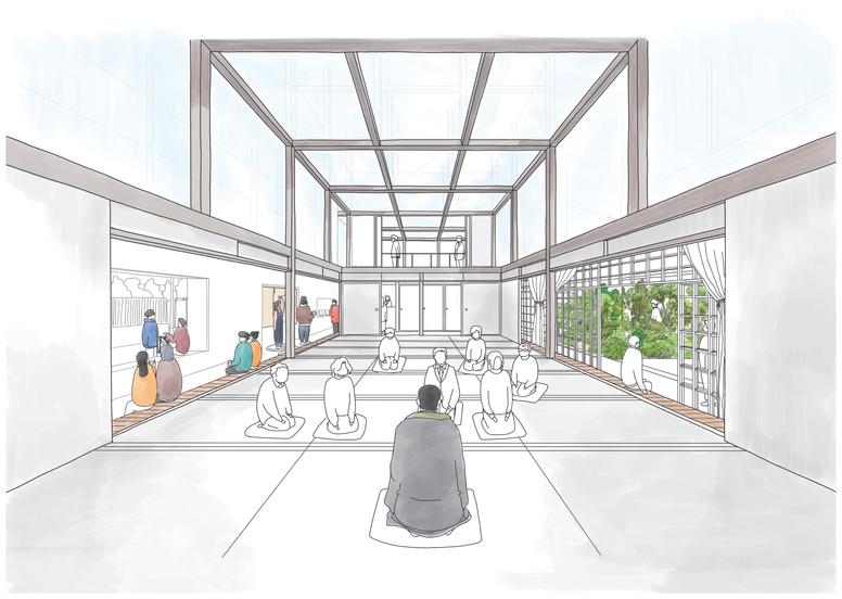 某所のお寺の移転プロジェクト。移転に伴いお寺の中に多数の異なるプログラム(カフェやギャラリーなど)を導入。20近くにも及ぶ多種多様なユーザー体験を一つ一つ、丁寧に分析しながら計画することで、利用者の目的やバックグラウンドに応じて様々な表情を見せる建築を構想。